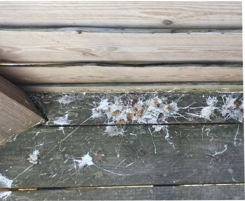 Als je goed kijkt zie je van alles, poep, plas en braaksels. De vogels slikken alles door, maar soms komen de droge restjes weer omhoog en dat spugen ze het weer uit. Het lijkt wel een kunstwerk!